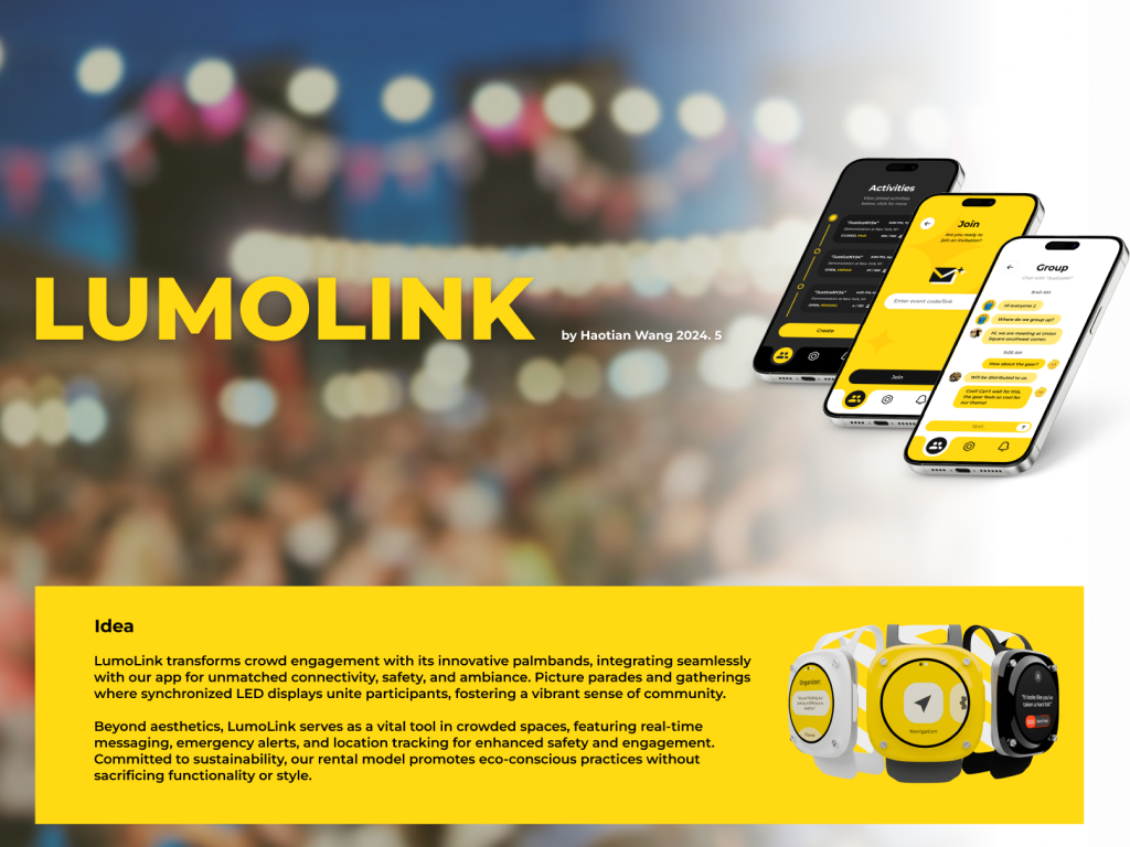 LumoLink is a smart, sustainable palm-worn band that syncs with an app to connect crowds through light, communication, and safety—turning large gatherings into unified, engaging, and secure shared experiences.