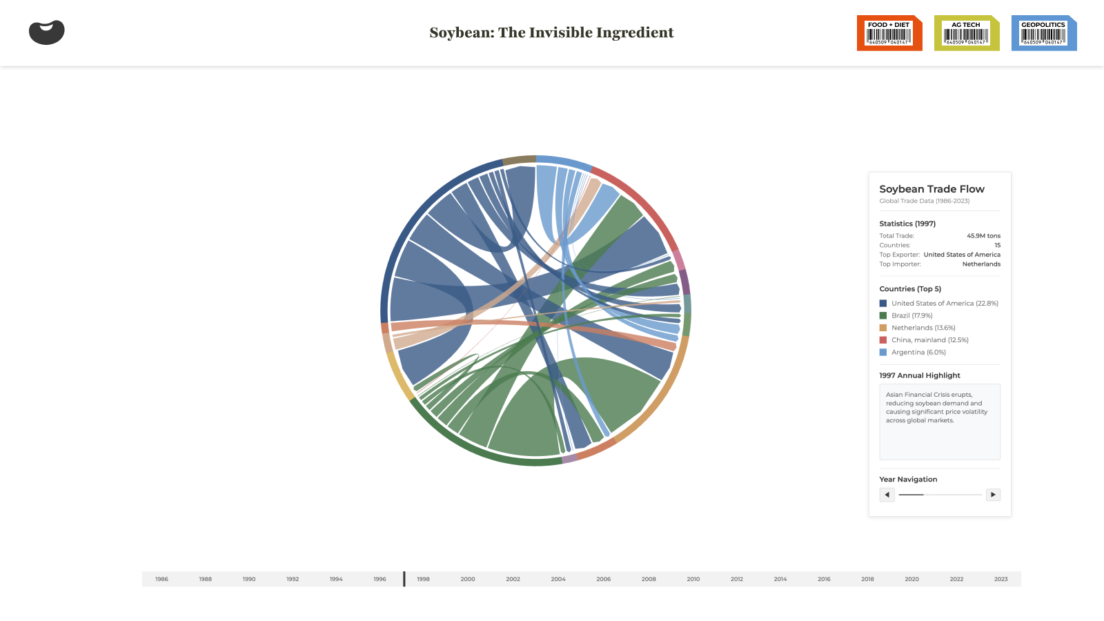 This data visualization project explores the global soybean ecosystem through historical, economic, and environmental perspectives. Developed over a four-week MDE studio, the work examines key issues including international trade flows, GMO soybean production, and the broader social and ecological impacts surrounding soybeans.